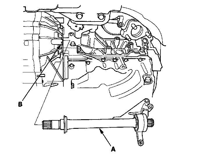 NOTE: Insert the intermediate shaft horizontally to prevent damaging the differential oil seal (B).