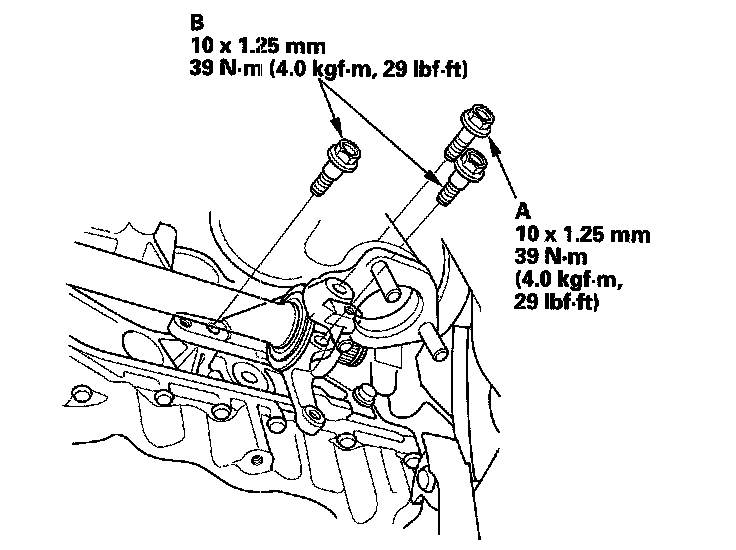 4. Install the flange bolt (A) and two dowel bolts (B).