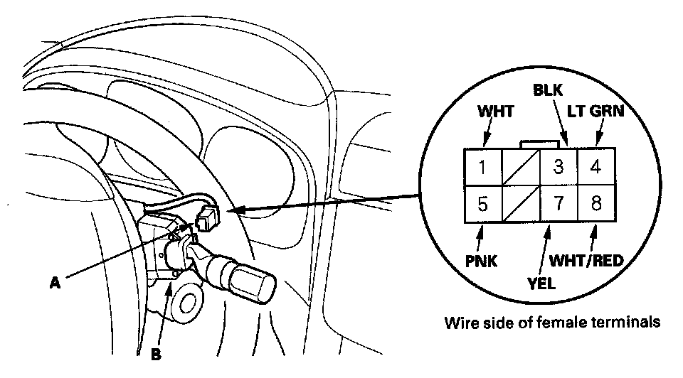 4. Disconnect the 8P connector (A) from the wiper/washer switch (B).