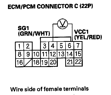 8. Measure voltage between ECM/PCM connector terminals C4 and C6.