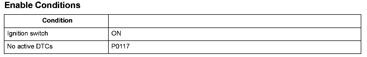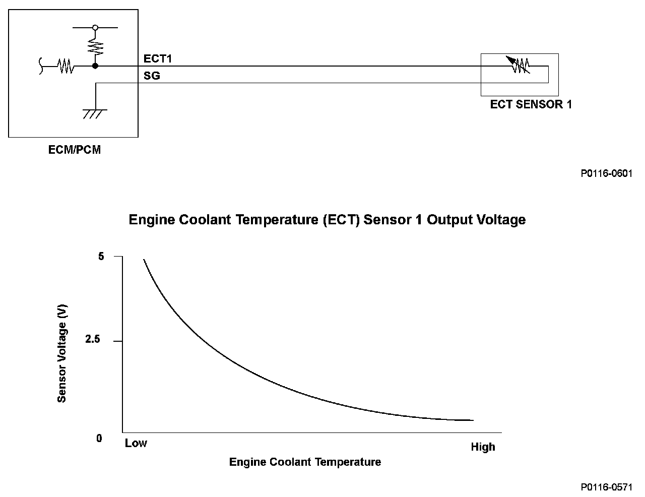 The engine coolant temperature (ECT) sensor 1 is used for air fuel ratio feedback control, ignition timing control, idle speed control, and other functions. The ECT sensor 1 resistance varies depending on the engine coolant temperature. As the engine coolant cools, the ECT sensor 1 resistance increases, and the engine control module (ECM)/powertrain control module (PCM) detects a high signal voltage. As the engine coolant warms, the ECT sensor 1 resistance decreases, and the ECM/PCM detects a low signal voltage. If the ECT sensor 1 output voltage is more than a set value when the engine coolant temperature is low, the ECM/PCM detects a malfunction and a DTC is stored.