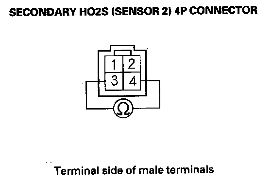 8. At the secondary HO2S (Sensor 2) side, measure resistance between secondary HO2S (Sensor 2) 4P connector terminals No. 3 and No. 4.