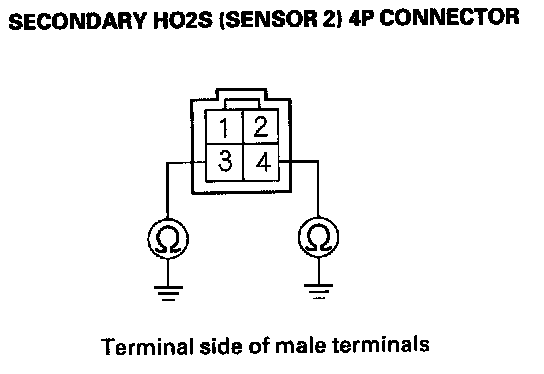 9. At the secondary HO2S (sensor 2) side, check for continuity between body ground and secondary HO2S (Sensor 2) 4P connector terminals No. 3 and No. 4 individually.