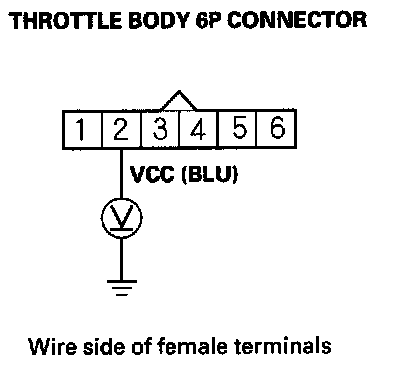 9. Measure voltage between throttle body 6P connector terminal No. 2 and body ground.