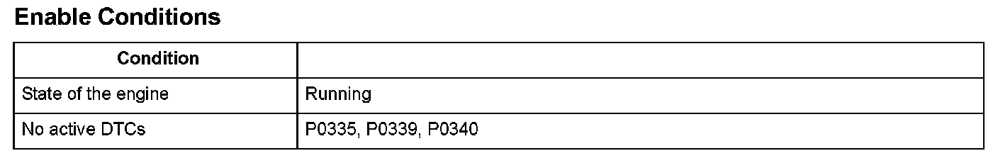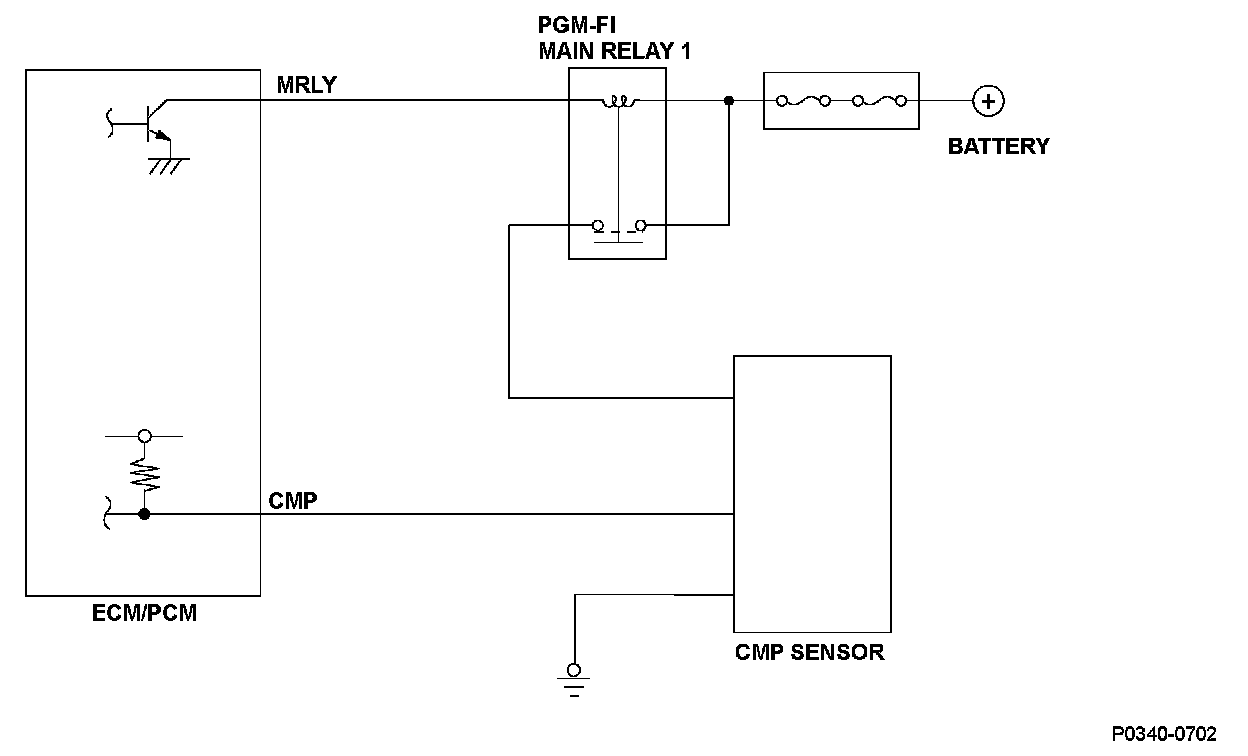 The camshaft position (CMP) sensor detects the intake camshaft timing and sends pulsing signals to the engine control module (ECM)/powertrain control module (PCM). The ECM/PCM determines the camshaft position according to the signals from the crankshaft position (CAP) sensor and the CMP sensor. If the number of pulsing signals from the CMP sensor during intervals between the CAP standard pulses is more or less than the proper number, a malfunction is detected and a DTC is stored.