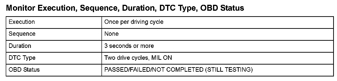 Monitor Execution, Sequence, Duration, DTC Type, OBD Status