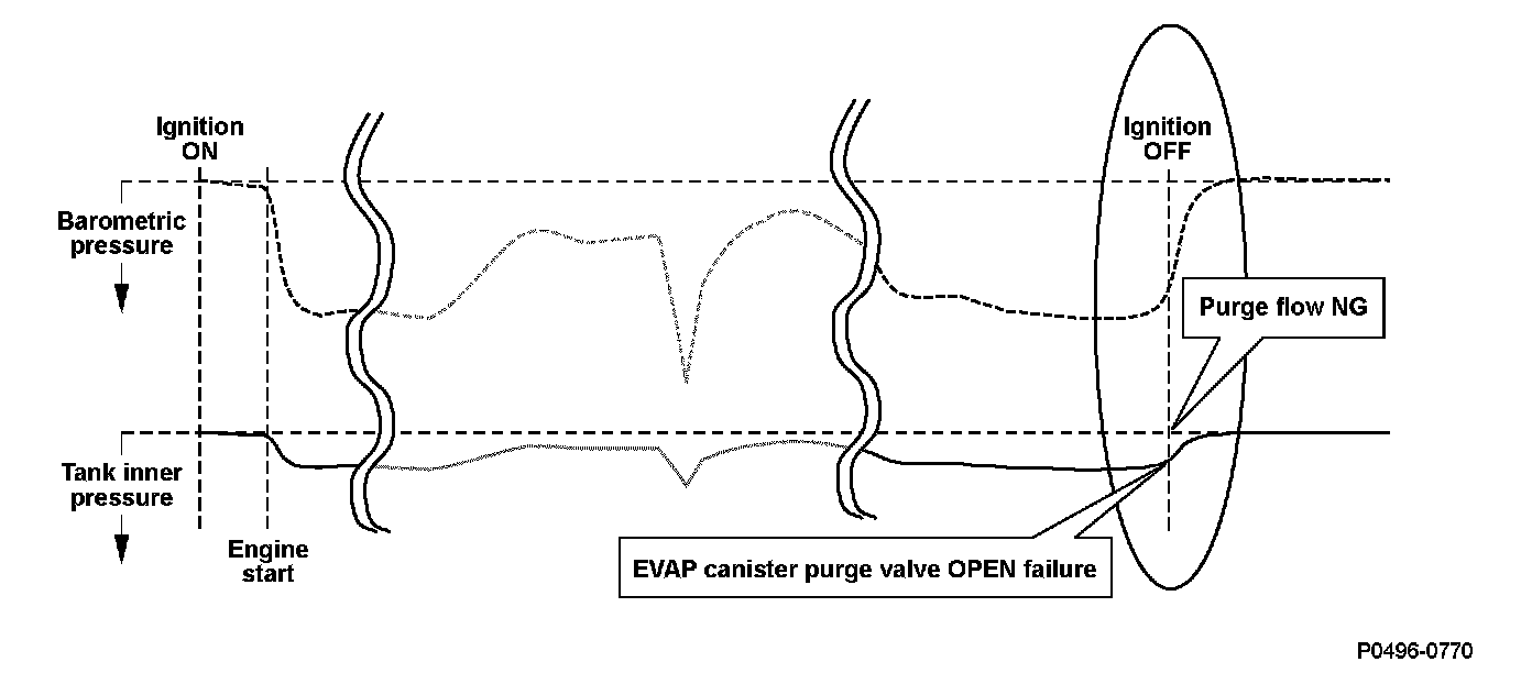The EVAP canister purge valve Opens normally (EVAP canister purge valve OPEN OK and detects that the purge flow is normal when the pulse of the EVAP canister purge valve drive cycle is transmitted to fuel tank pressure (FTP) sensor by the purge flow (pulse method).