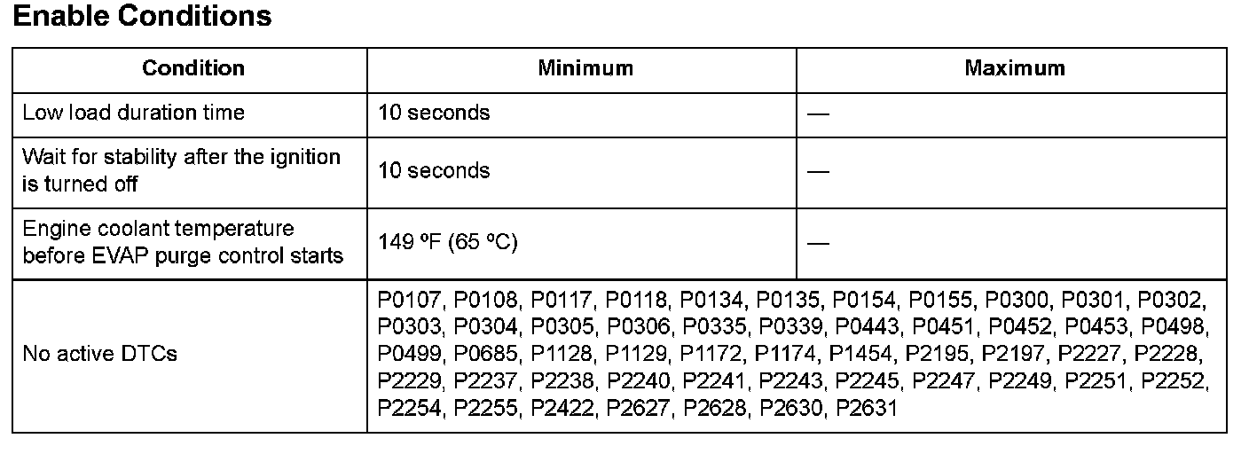 The output from the EVAP canister purge valve is 0.2 kPa (0.07 in.Hg, 2 mmHg) or more for at least 10 seconds.
