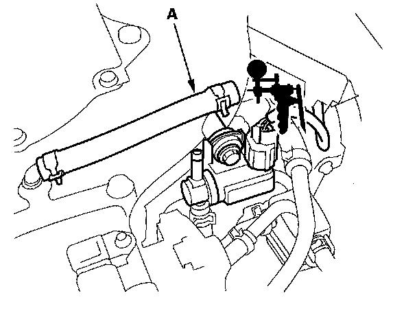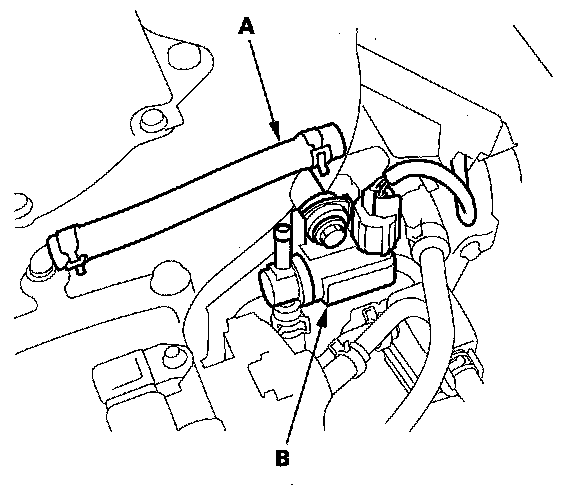 5. Disconnect the vacuum hose (A) from the EVAP canister purge valve (B).