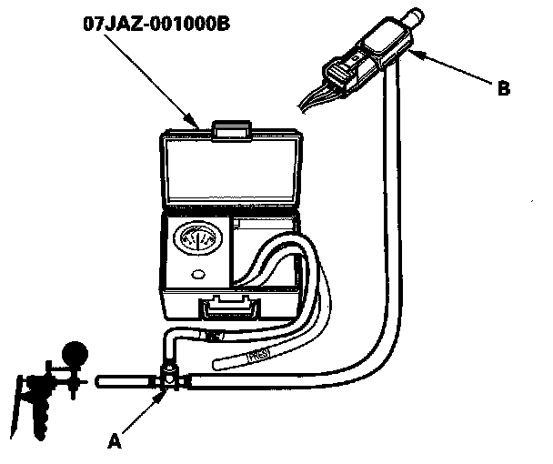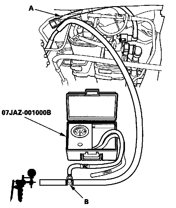 6. Disconnect the vacuum hose (A) from the purge line (at the EVAP canister side), and connect a T-fitting (B) from the vacuum gauge and the vacuum pump/gauge, 0 - 30 in.Hg, to the hose as shown.