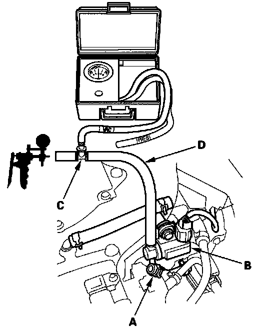 10. Disconnect the vacuum hose (A) from the EVAP canister purge valve (B). Connect a T-fitting (C) from the vacuum gauge and the vacuum pump/gauge, 0 - 30 in.Hg, to the hose (D) as shown.