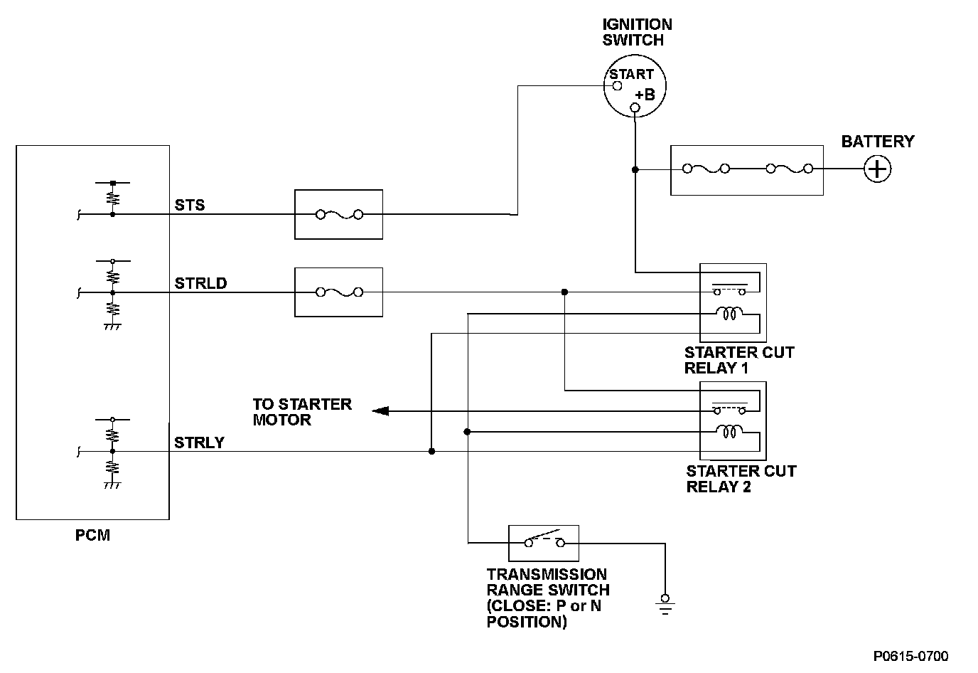 Also a diagnosis line (STRLD) is used to monitor voltage in the middle of starter cut relay 1 and starter cut relay 2. The PCM detects an OPEN malfunction an ON malfunction of starter cut relay 1, and an ON malfunction of starter cut relay 2, according to the information.