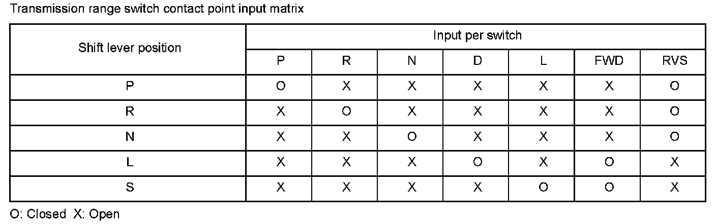The transmission range switch is attached to the control shaft. Operating the shift lever makes the control shaft rotate via the shift cable. The A/T gear position indicator indicates which position is selected according to the Low/High signal combinations which vary based on the control shaft rotational angle. The control shaft changes the position of the transmission range switch, activates the manual valve, and switches hydraulic pressure to shift the transmission through forward/neutral/reverse. The transmission range switch signal is used to determine the shift schedule. The voltage is 12 V (High) at the powertrain control module (PCM) input terminal when each transmission range switch position is Open, and it is 0 V (Low) when each switch is closed. If the FWD switch stays Open while the vehicle repeatedly accelerates to a specified vehicle speed and then stops despite being in the D position, the PCM detects a malfunction in the transmission range switch (Open) and stores a DTC.