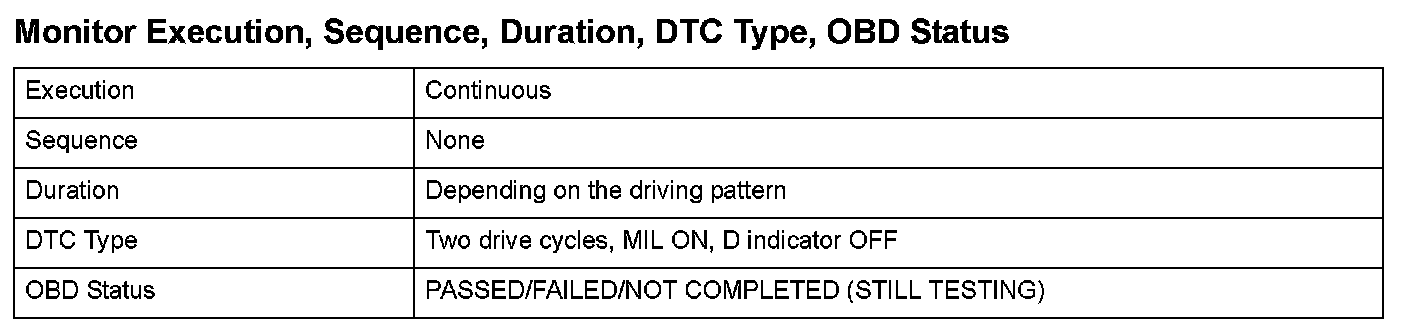 Monitor Execution, Sequence, Duration, DTC Type, OBD Status