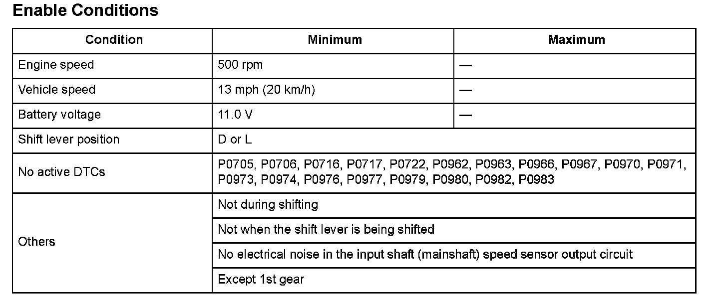 The vehicle speed measured by the input shaft (mainshaft) speed sensor/(divided by) the vehicle speed measured by the output shaft (countershaft) speed sensor is greater than 6.0 for at least 10 seconds.