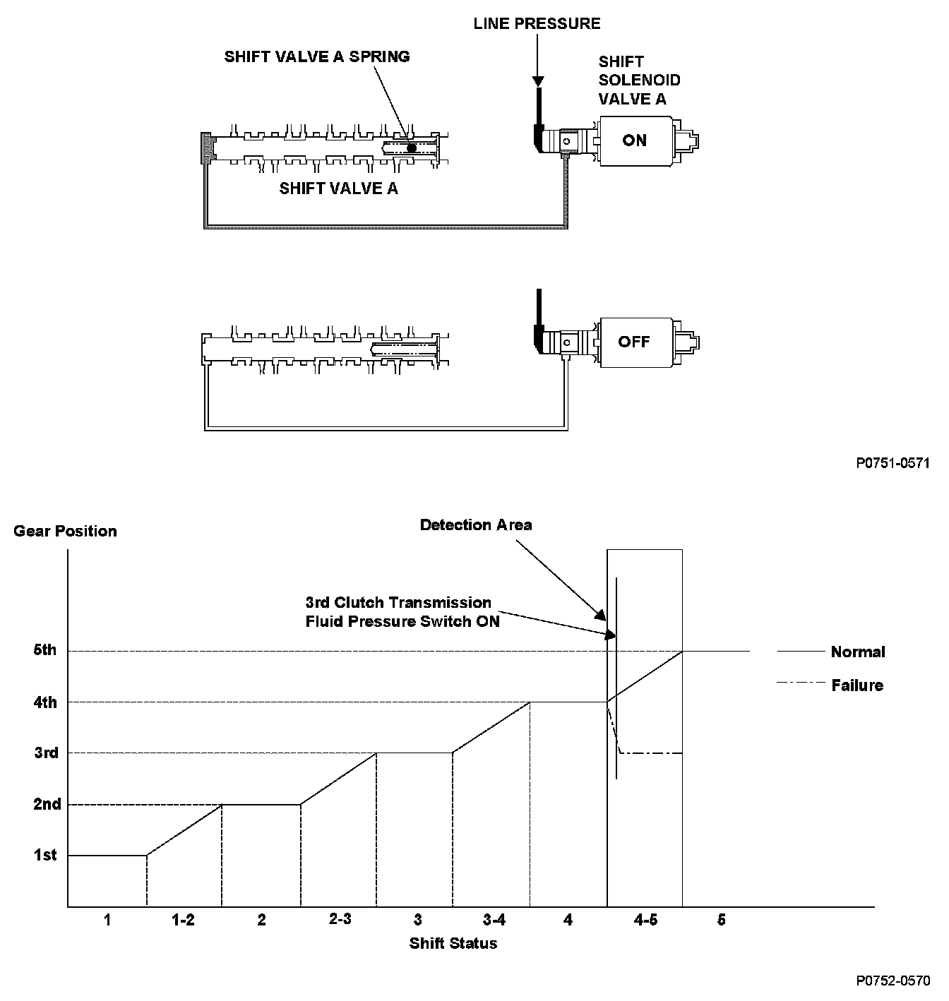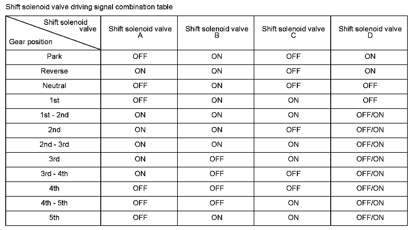 Shift solenoid valve A is installed in the transmission housing. It is controlled by the ON/ OFF signal from the powertrain control module (PCM) to apply line pressure to shift valve A. The signal from the PCM is output to apply clutch pressure control pressure to the proper gear change clutch according to the gear change schedule. When the signal to shift solenoid valve A from the PCM is OFF, and line pressure is discharged, shift valve A is inactive. When the signal to shift solenoid valve A from the PCM is ON, and line pressure is applied to shift valve A, it operates against the shift valve A spring. The PCM monitors the transmission fluid switch at the speed change stage determined by the shift schedule. When the wrong transmission fluid switch is turned on for a given speed change mode, a shift solenoid valve turn-on malfunction is detected and a DTC is stored.