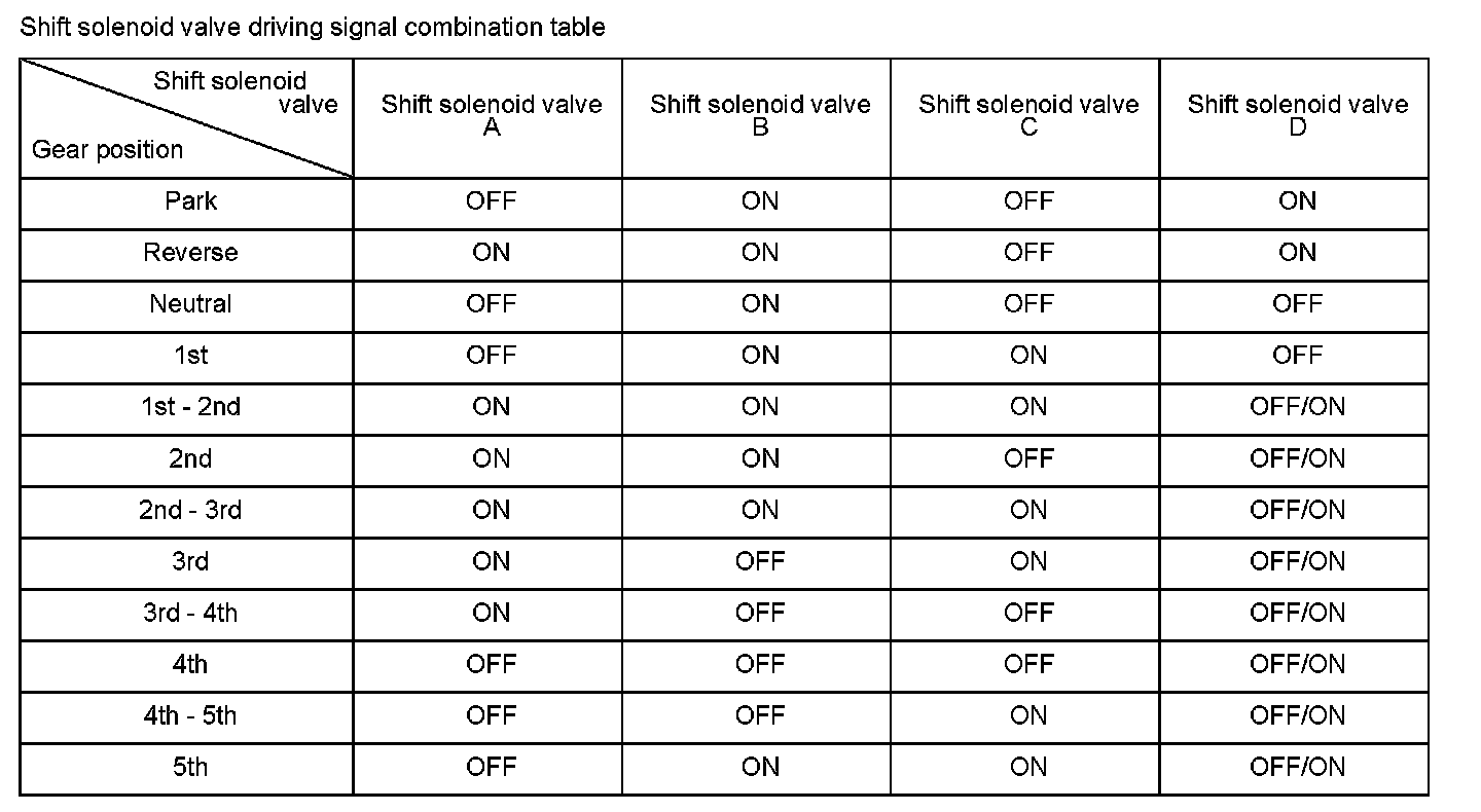 Shift solenoid valve D is installed in the transmission housing. It is controlled by the ON/ OFF signal from the powertrain control module (PCM) to apply line pressure to lock-up shift valve. The signal from the PCM is output to apply clutch pressure control pressure to the proper gear change clutch according to the gear change schedule. When the signal to shift solenoid valve D from the PCM is ON, and line pressure is applied to the lock-up shift valve, it operates against the lock-up shift valve spring. When the signal to shift solenoid valve D from the PCM is OFF, and line pressure is discharged, the lock-up shift valve is inactive. The PCM monitors the input shaft (mainshaft) speed and the output shaft (countershaft) speed at the gear change determined by the shift schedule. When an improper gear ratio is output compared to the predetermined gear change mode, a shift solenoid valve D OFF failure is detected and a DTC is stored.