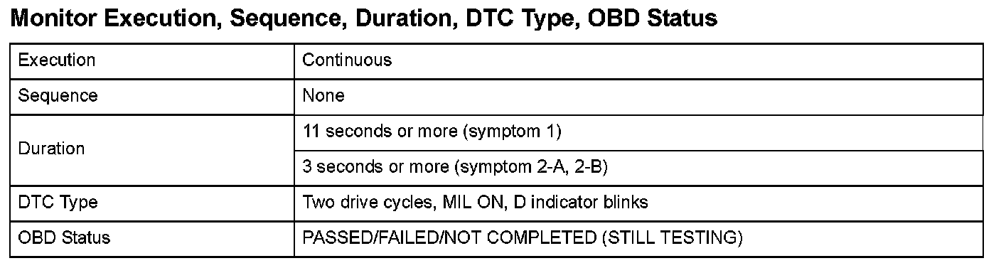 Monitor Execution, Sequence, Duration, DTC Type, OBD Status