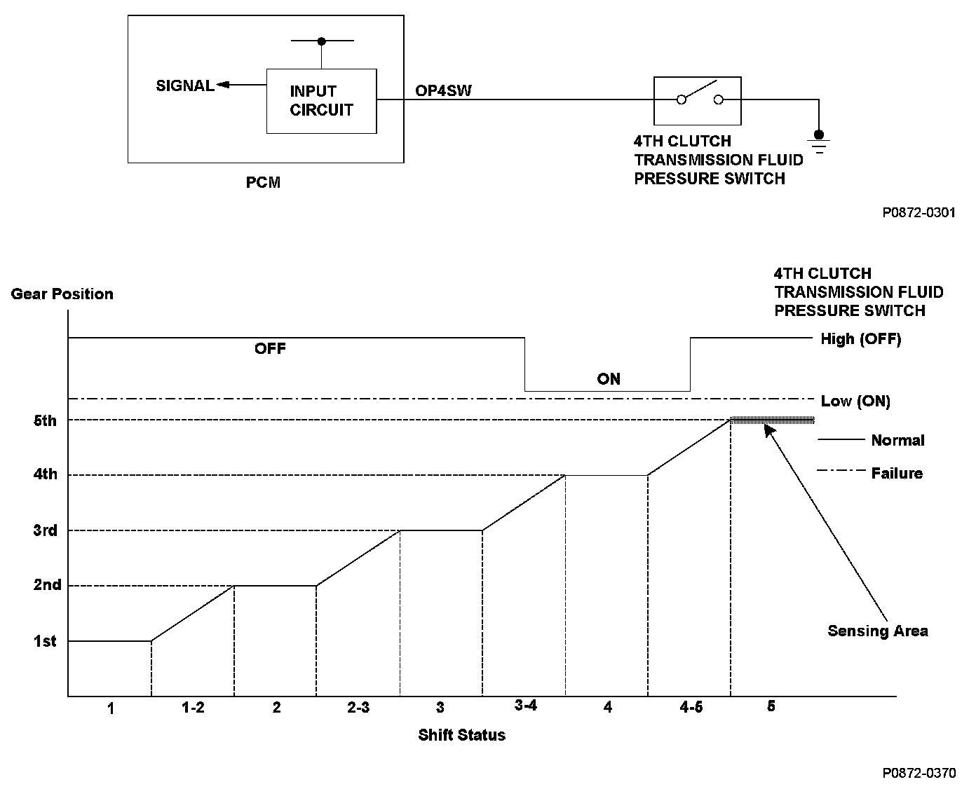 The input signal from the 4th clutch transmission fluid pressure switch to the PCM is low when driving in 5th gear.