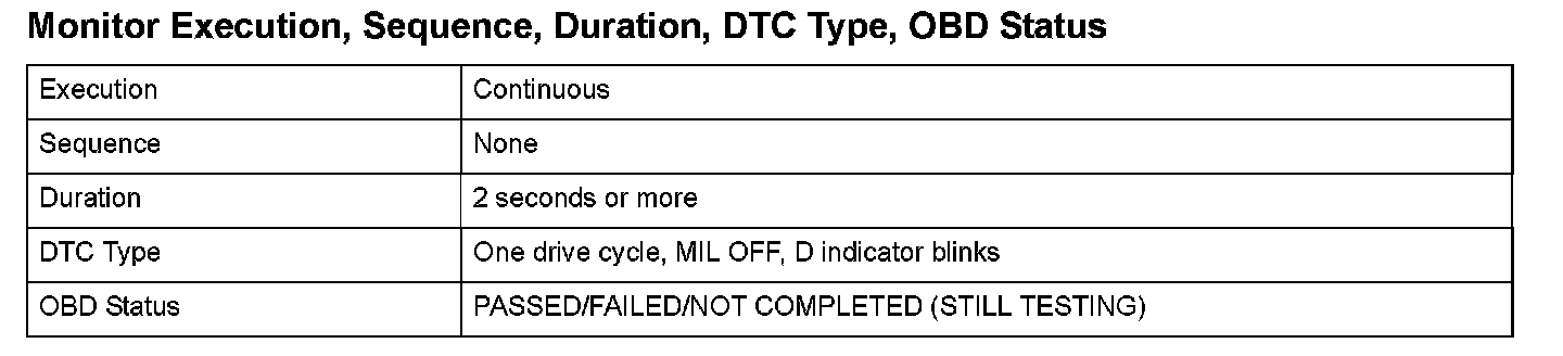 Monitor Execution, Sequence, Duration, DTC Type, OBD Status