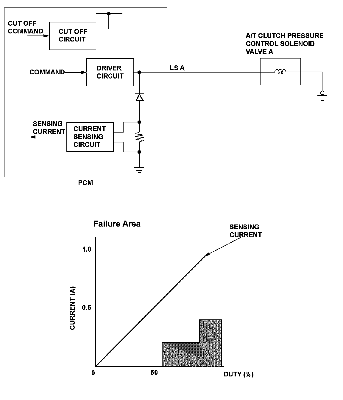 A/T clutch pressure control solenoid valve A is used for clutch pressure control. A spool in A/T clutch pressure control solenoid valve A pushes a valve according to the duty cycle that is controlled by the powertrain control module (PCM) so the hydraulic pressure is proportional to the current. The PCM measures the current flowing through A/T clutch pressure control solenoid valve A and uses feedback control to compensate for the difference between the actual current and the commanded one. If the measured current for the PCM output duty cycle is not within a specified range (Open or short), a malfunction is detected and a DTC is stored.