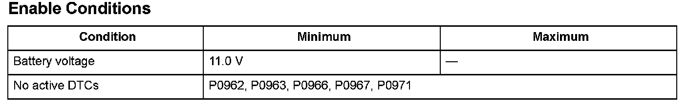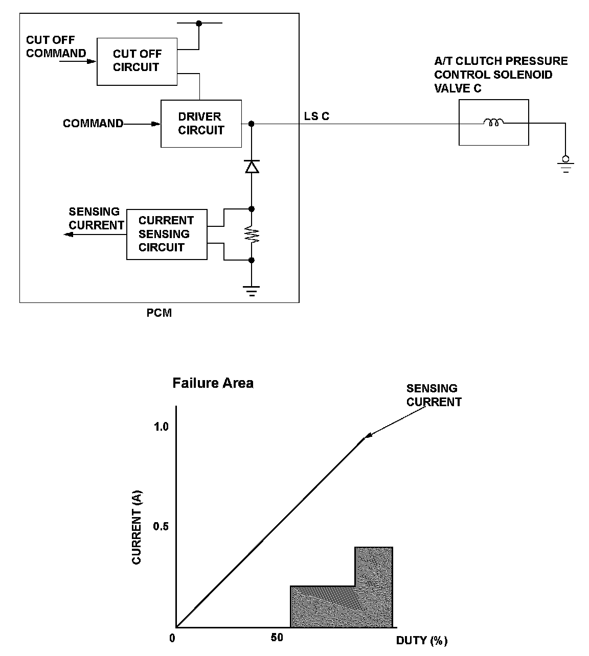 A/T clutch pressure control solenoid valve C is used for clutch pressure control and lock-up control. A spool in A/T clutch pressure control solenoid valve C pushes a valve according to the duty cycle that is controlled by the powertrain control module (PCM) so the hydraulic pressure is proportional to the current. The PCM measures the current flowing through A/T clutch pressure control solenoid valve C and uses feedback control to compensate for the difference between the actual current and the commanded one. If the measured current for the PCM output duty cycle is not within a specified range (Open or short), a malfunction is detected and a DTC is stored.