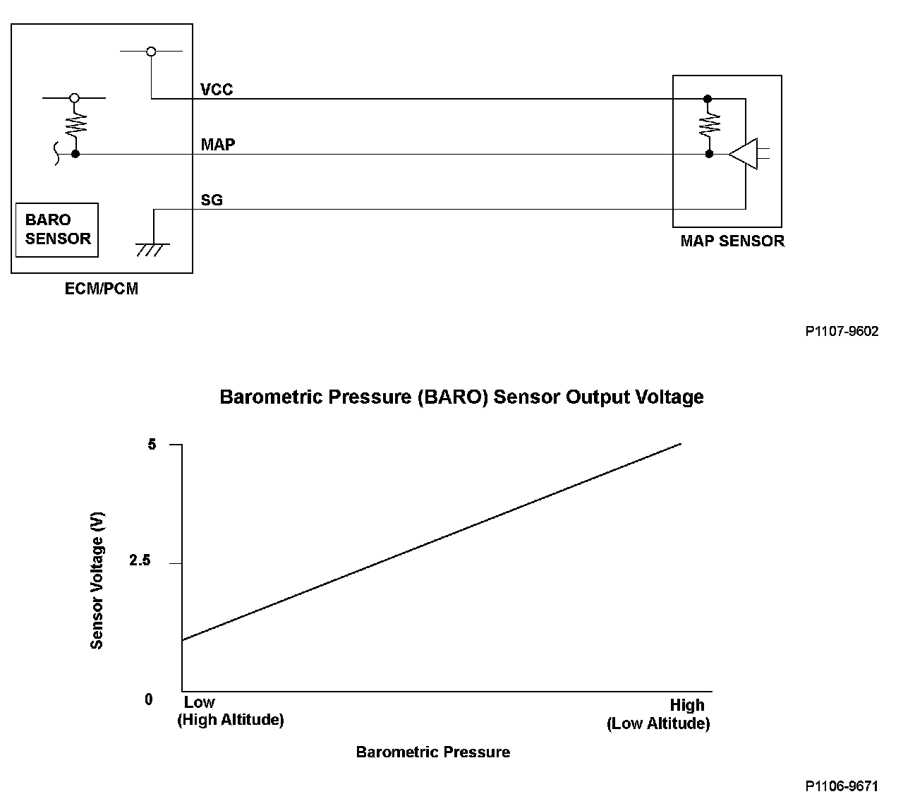 The barometric pressure (BARO) sensor is built into the engine control module (ECM)/powertrain control module (PCM), and it monitors atmospheric pressure. The ECM/PCM estimates appropriate intake airflow from the manifold absolute pressure (MAP) sensor output voltage and BARO sensor output voltage. When BARO sensor output voltage is within the specified range, a malfunction is detected and a DTC is stored.
