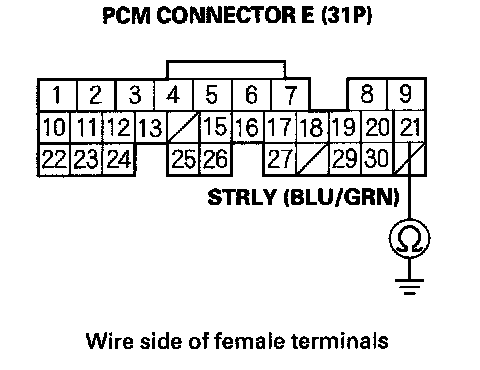 8. Check for continuity between PCM connector terminal E21 and body ground.