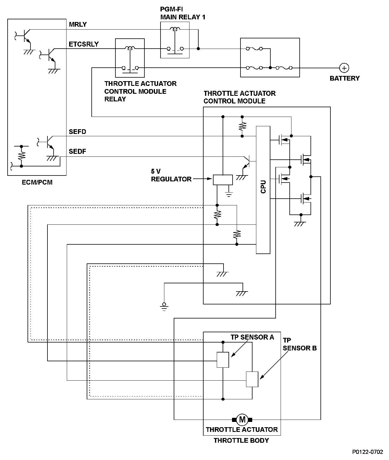 The electronic throttle control system (ETCS) controls the throttle valve Opening. The system is composed of the throttle actuator, the throttle valve, throttle position (TP) sensors A and B, the throttle actuator control module, the throttle actuator control module relay, the accelerator pedal position (APP) sensor, and the engine control module (ECM)/powertrain control module (PCM).