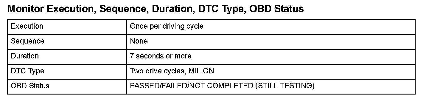 Monitor Execution, Sequence, Duration, DTC Type, OBD Status
