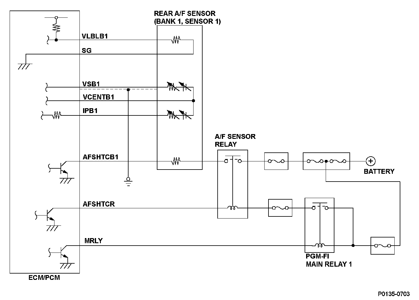 The rear air/fuel ratio (A/F) sensor (bank 1, sensor 1) is installed in the exhaust manifold and detects oxygen content in the exhaust gas. The rear A/F sensor transmits a signal to the engine control module (ECM)/powertrain control module (PCM). The ECM/PCM controls fuel injection duration by comparing the target air/fuel ratio with the rear A/F sensor signal. The sensor includes the VS cell, the pump cell, the atmospheric reference cavity, the diffusion layer, and the heater, and it enables overall feedback control.