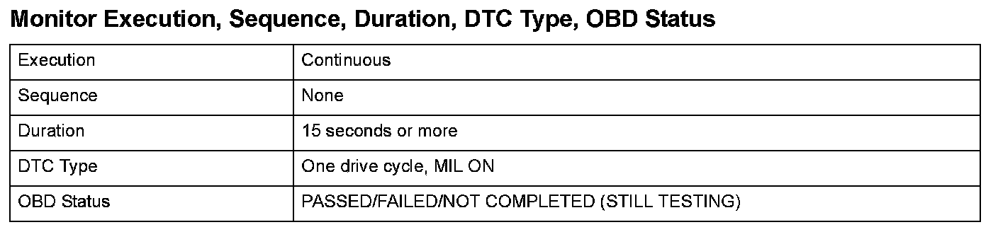 Monitor Execution, Sequence, Duration, DTC Type, OBD Status