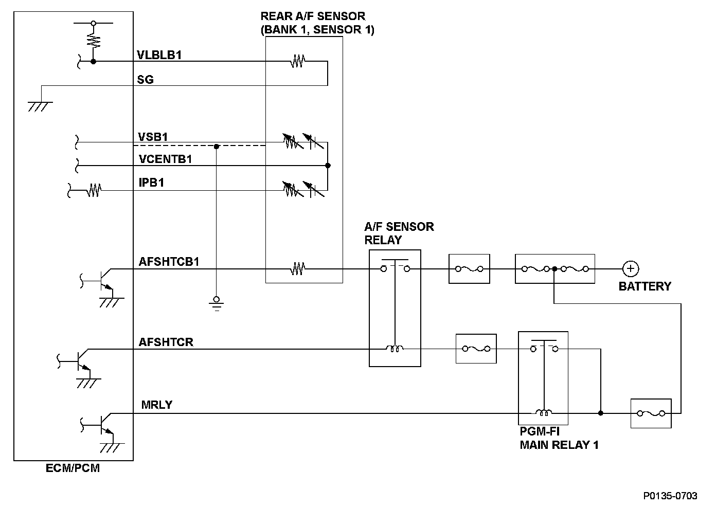 When the VSB1 (sensor cell voltage supply, bank 1) terminal voltage is less than the specified value and the IPB1 (pump cell current draw, bank 1) terminal voltage is more than the specified value for more than a set time, the ECM/PCM detects a malfunction and a DTC is stored.