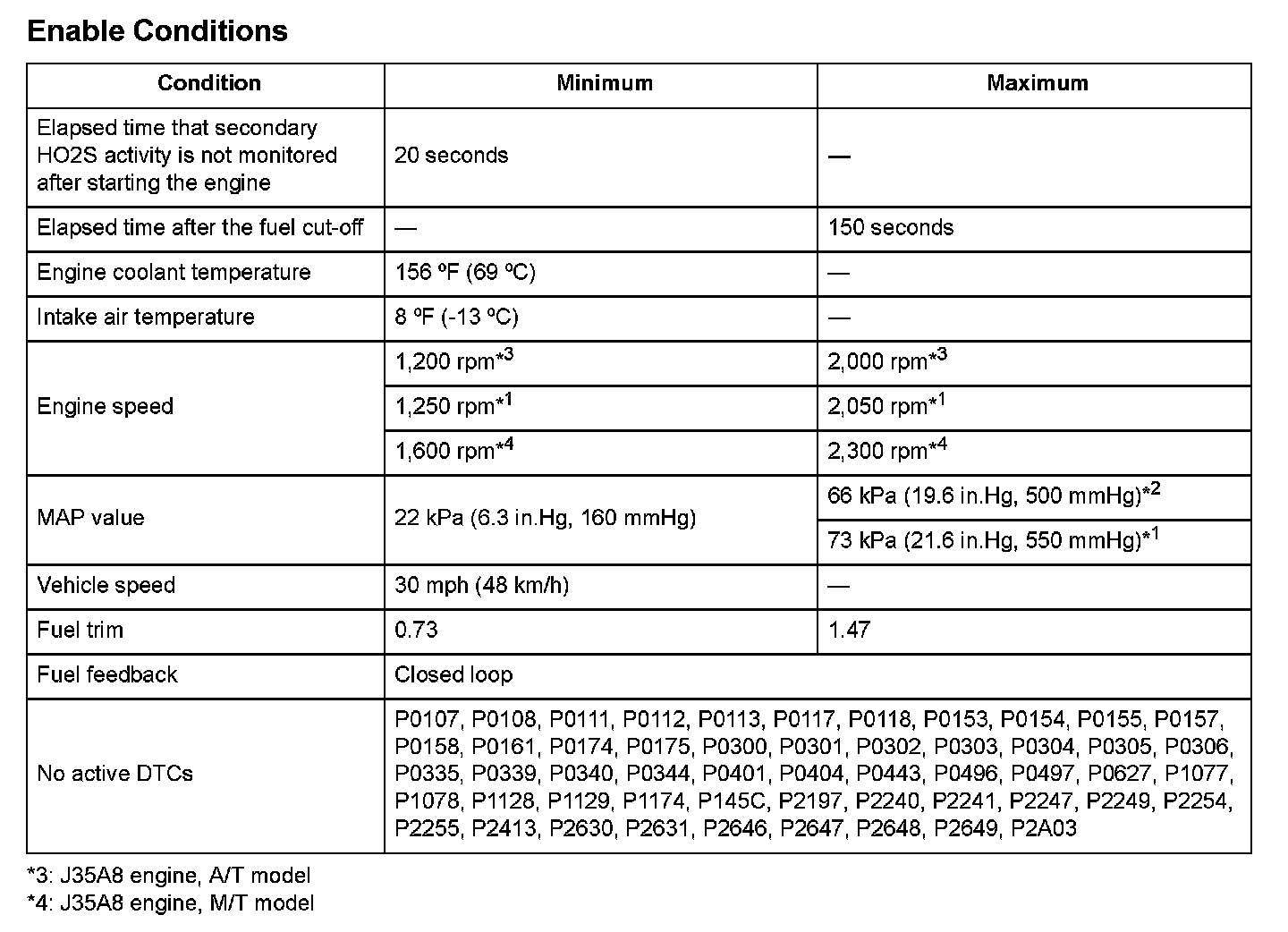 The front secondary HO2S (bank 2, sensor 2) output voltage is 0.650 V or less.