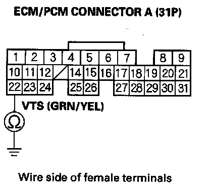 11. Check for continuity between ECM/PCM connector terminal A22 and body ground.