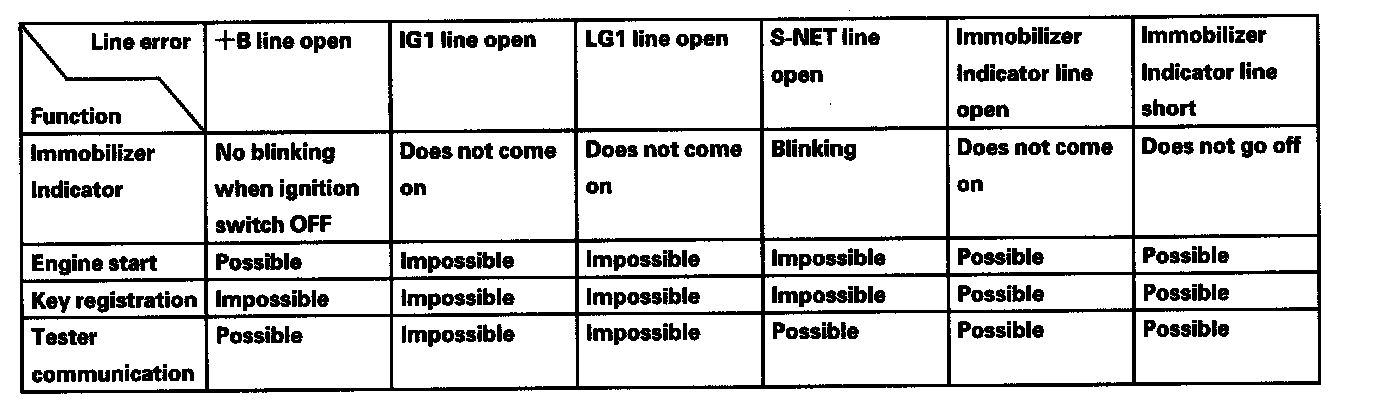 If a malfunction occurs in the immobilizer circuit, use the following table to cross-reference the malfunctioning function to the line(s) that should be checked: