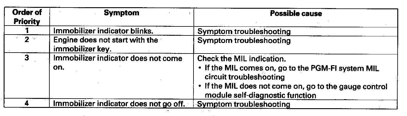 Troubleshoot the immobilizer system by the order of the priority shown: