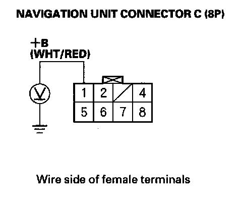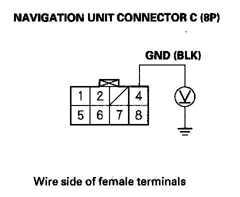 6. Measure the voltage between navigation unit connector C (8P) terminal No. 1 and body ground.