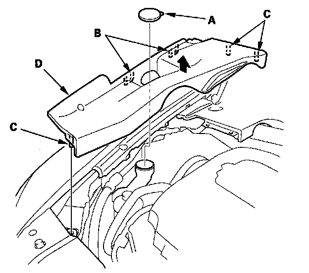 1. Remove the washer reservoir cap (A), and release the hooks (B) and pins (C), then remove the right side engine compartment cover (D).