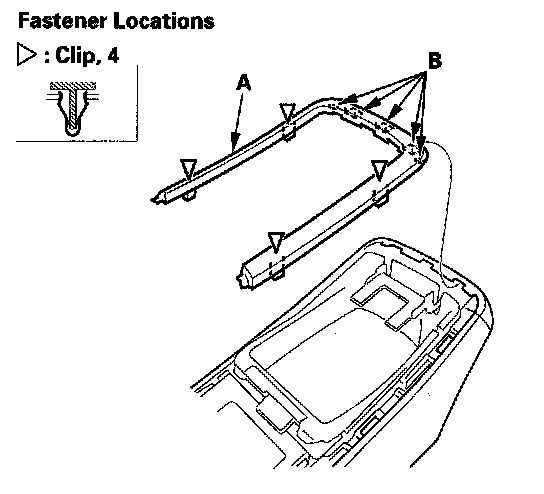 3. Detach the clips, then pull the console upper trim (A) up and forward to release the hooks (B).