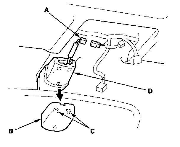 2. Disconnect the connector (A), and carefully remove the bracket cover (B) by releasing the hooks (C). Take care not to scratch the cover and mirror bracket (D).