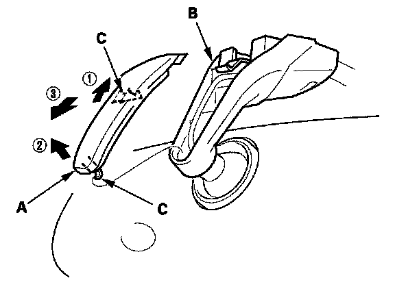 4. Remove the wire cover (A) from the mirror bracket (B) by releasing the hooks (C) in the sequence shown.
