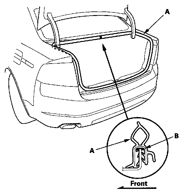 Trunk Lid Weatherstrip Replacement1. Remove the trunk lid weatherstrip (A) by pulling it off.