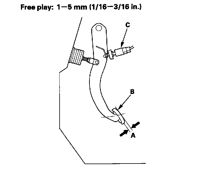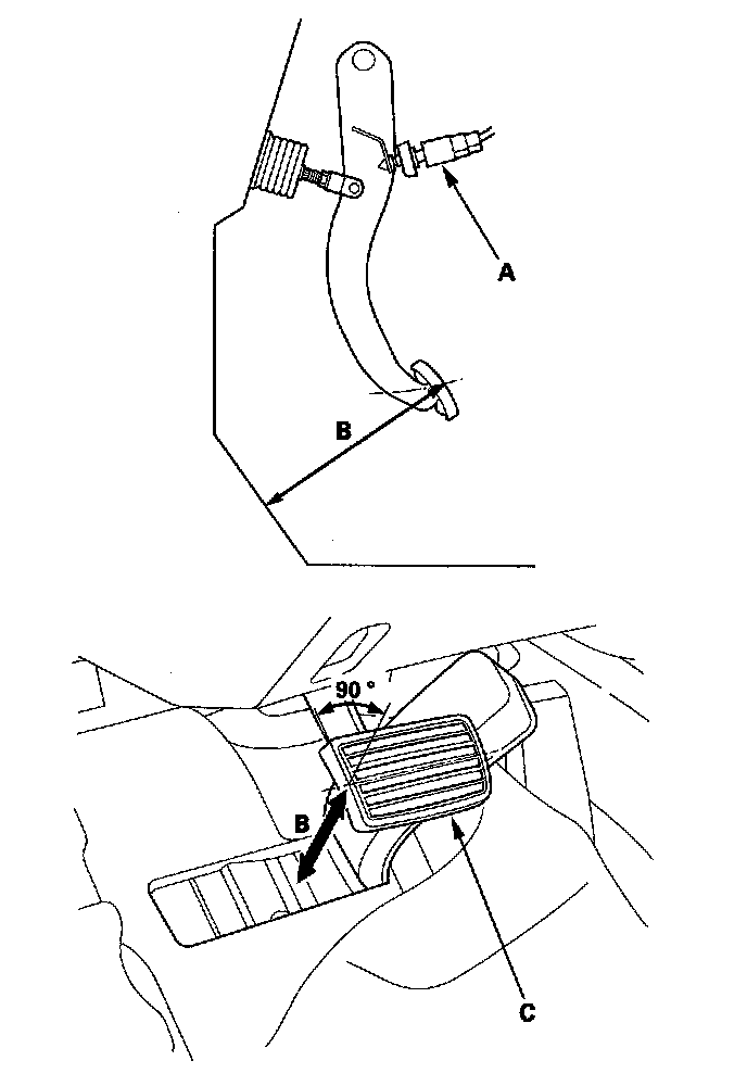 1. With the engine off, inspect the play (A) at the brake pedal pad (B) by pushing the brake pedal by hand. If the brake pedal free play is out of specification, adjust the brake pedal position switch (C). If the brake pedal free play is insufficient, it may result in brake drag.