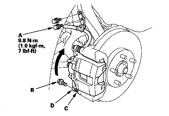 5. Remove the flange bolt (B) while holding the caliper pin (C) with a wrench being careful not to damage the pin boot, and pivot the caliper (D) up out of the way. Check the hose and pin boots for damage and deterioration.