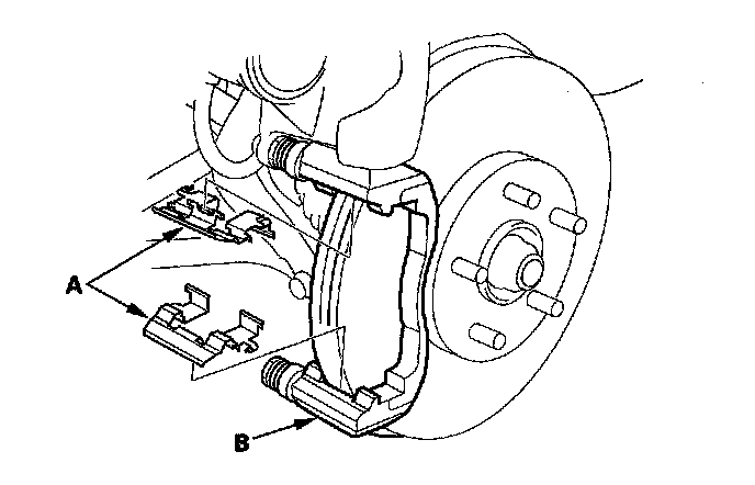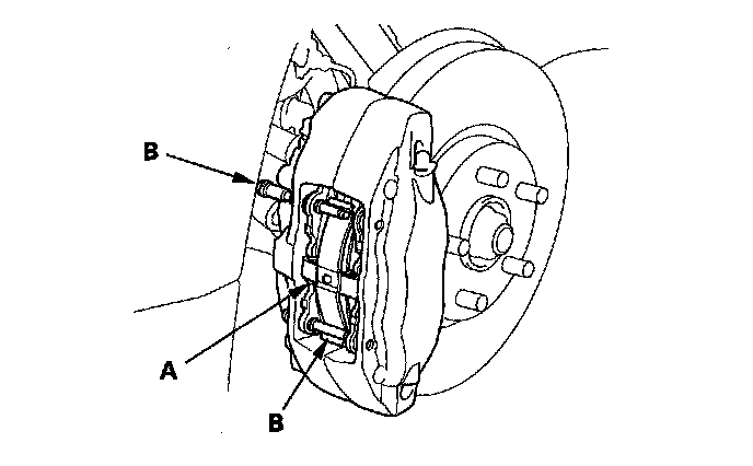 8. Clean the caliper bracket (B) thoroughly; remove any rust, and check for grooves and cracks.