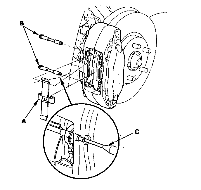 4. Depress pad spring (A). Remove pad pins (B) from the caliper by pushing from the outside to the inside with a commercially available 5/32" pin punch (C).