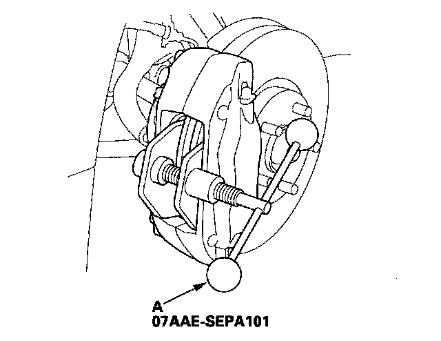 8. Mount the brake caliper piston compressor (A) on the caliper.