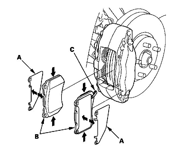 15. Install the brake pads and pad shims correctly. Install the brake pad with the wear indicator (C) on the upper inside. If you are reusing the brake pads, always reinstall the brake pads in their original positions to prevent a momentary loss of braking efficiency.