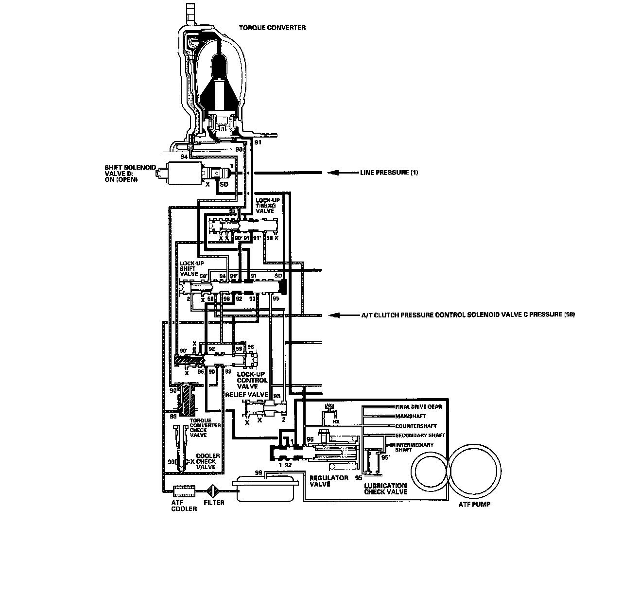 As the speed of the vehicle reaches the programmed value, PCM turns shift solenoid valve D ON, and shift solenoid valve D uncovers the port of shift solenoid valve D pressure (SD) to the lock-up shift valve. The lock-up shift valve is moved to the left side to uncover the port of torque converter pressure (91) leading to the right side of the torque converter to engage the torque converter clutch. The PCM also controls A/T clutch pressure control solenoid valve C and A/T clutch pressure control solenoid valve C pressure (58) is applied to the lock-up control valve and the lock-up timing valve. When A/T clutch pressure control solenoid valve C pressure (58) is low, torque converter pressure (91) from the lock-up timing valve is low. The torque converter clutch is engaged partially. A/T clutch pressure control solenoid valve C pressure (58) increases, and the lock-up timing valve moves to the left side uncovering the port and changing the torque converter pressure to high. Under this condition, the torque converter clutch is engaged by pressure from the right side of the torque converter; this condition is partial lock-up.